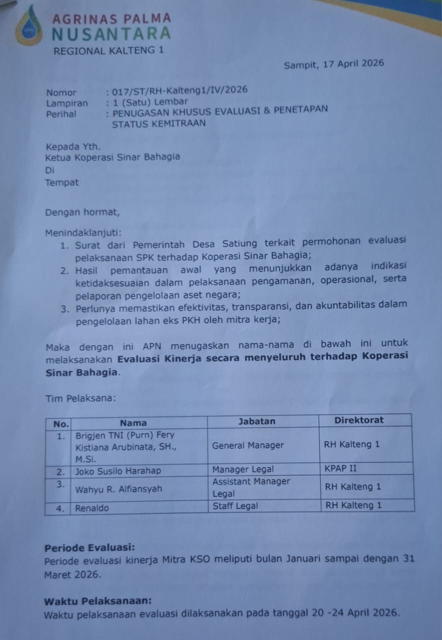 Semua bermula dari langkah Kepala Desa Satiung yang mengajukan permohonan evaluasi kepada PT Agrinas Palma Nusantara RH.1 Kalimantan Tengah. Namun di balik itu, muncul pertanyaan besar—apa yang sebenarnya terjadi di tubuh Koperasi Sinar Bahagia?