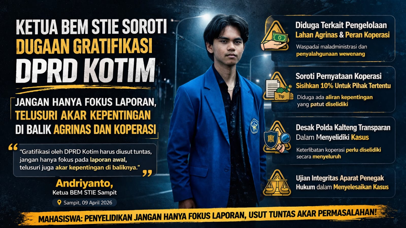 Ketua BEM STIE Sampit, Andriyanto, menegaskan bahwa kasus ini tidak boleh dipersempit hanya sebagai laporan hukum biasa. Ia melihat ada benang kusut yang jauh lebih dalam, yang jika tidak diurai, justru akan melanggengkan praktik-praktik gelap di balik kekuasaan.